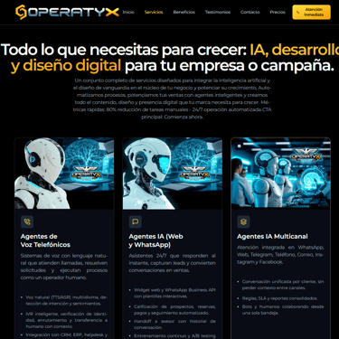 Un conjunto completo de servicios diseñados para integrar la inteligencia artificial y el diseño de vanguardia en el núcleo de tu negocio y potenciar su crecimiento, Automatizamos procesos, potenciamos tus ventas con agentes inteligentes y creamos todo el contenido, diseño y presencia digital que tu marca necesita para crecer. Métricas rápidas: 80% reducción de tareas manuales - 24/7 operación automatizada CTA principal: Comienza ahora.